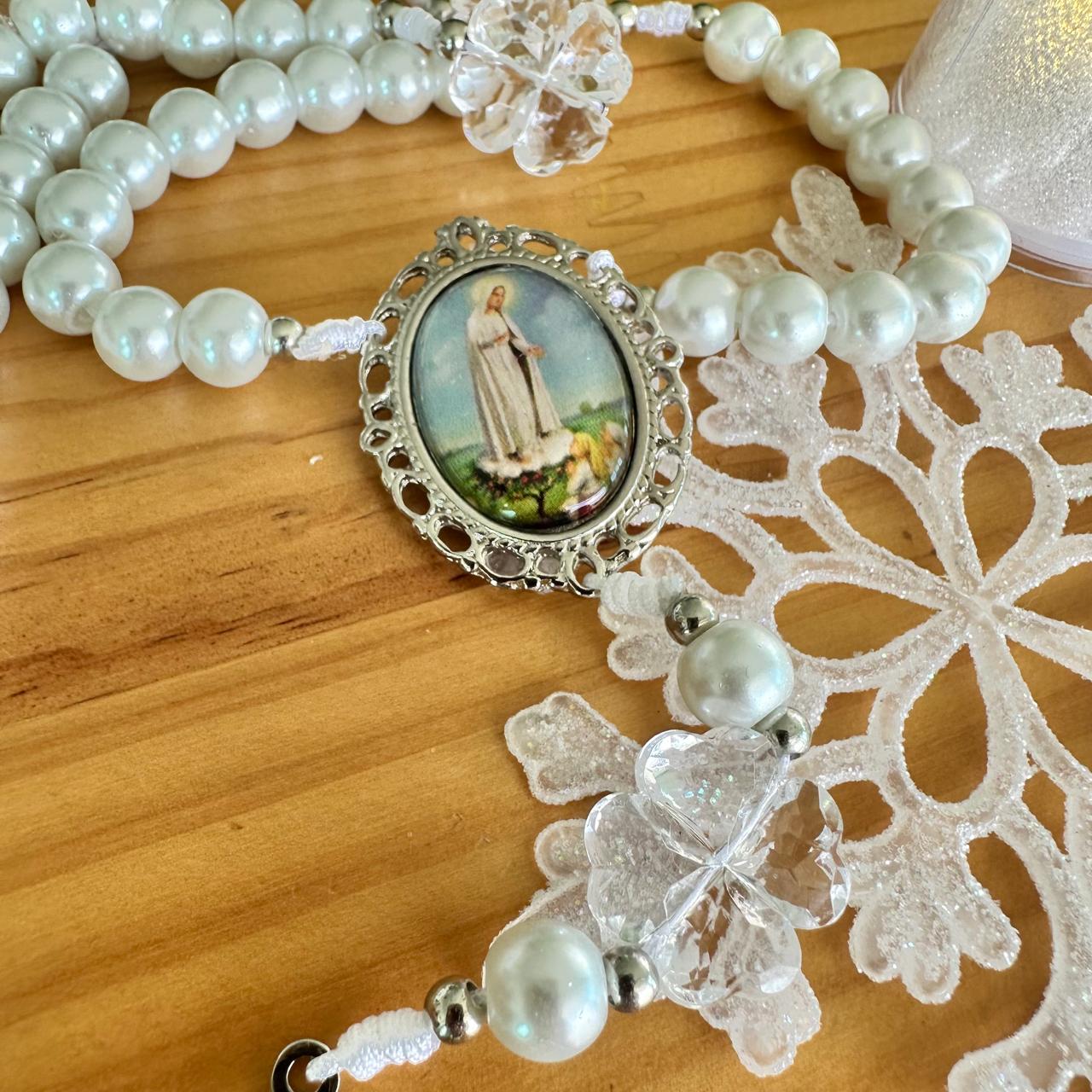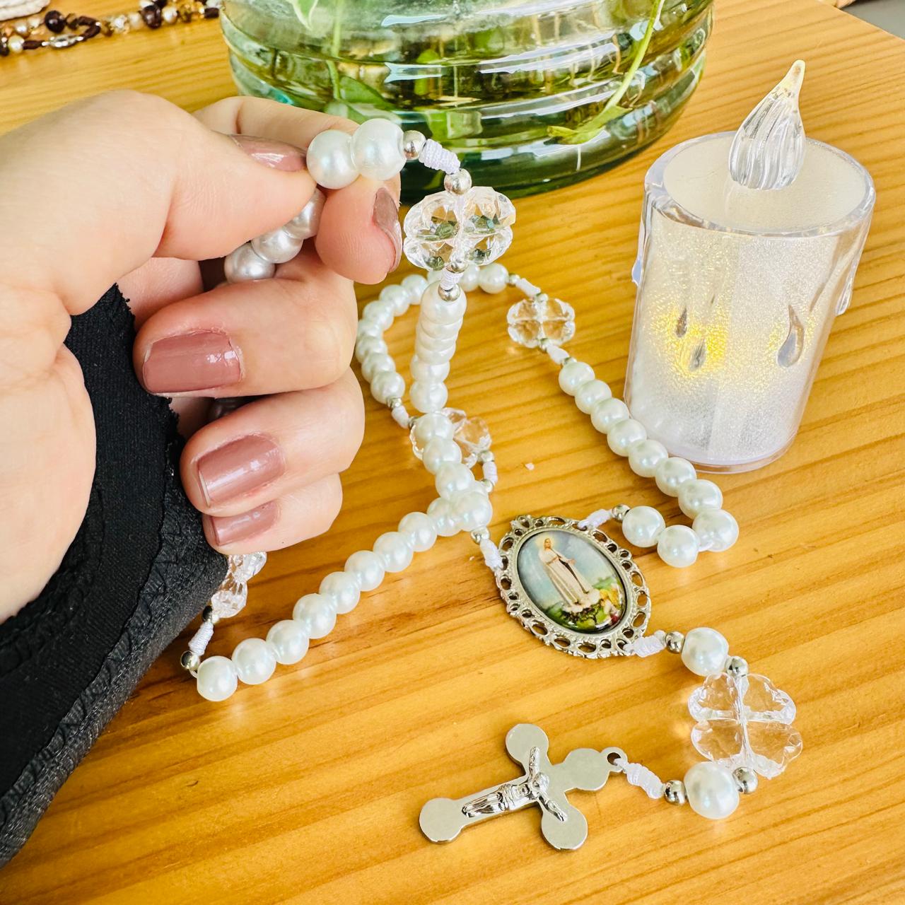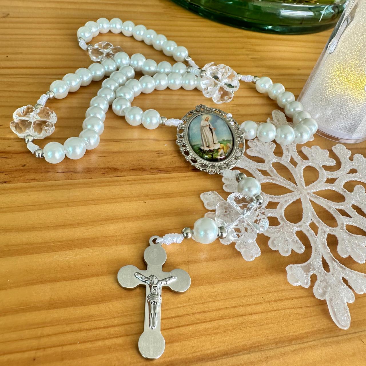Rosario tradicional, con medalla de la Virgen de Fátima y cruz de San Benito.