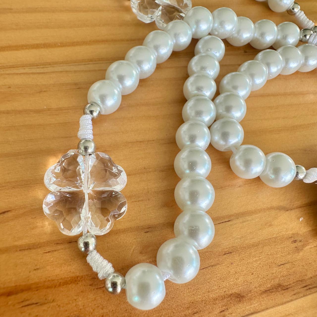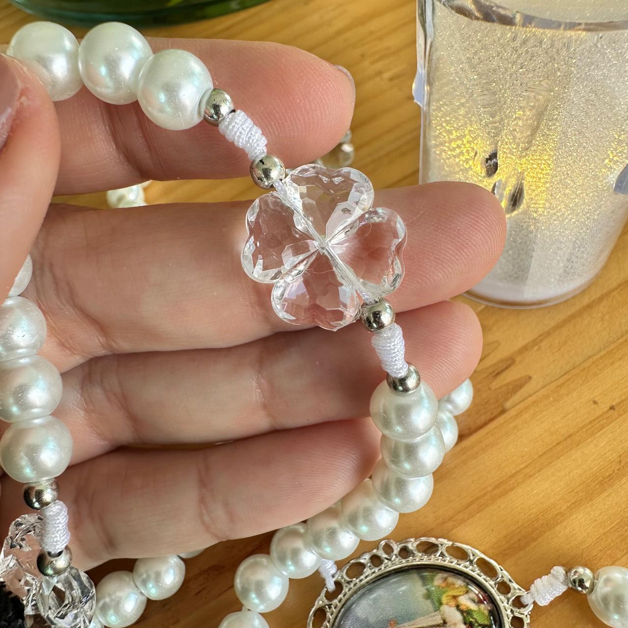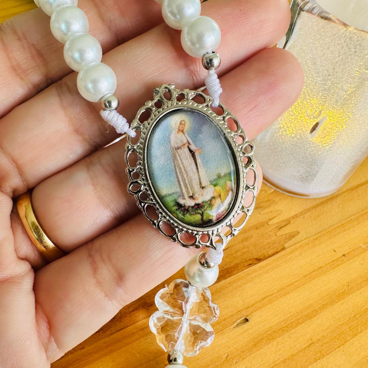 Rosario tradicional, con medalla de la Virgen de Fátima y cruz de San Benito.