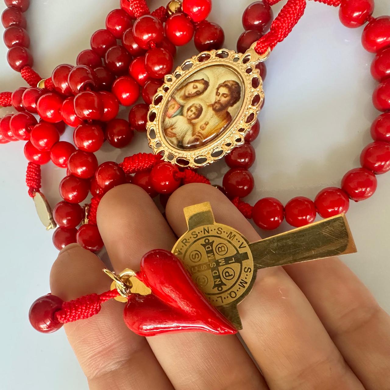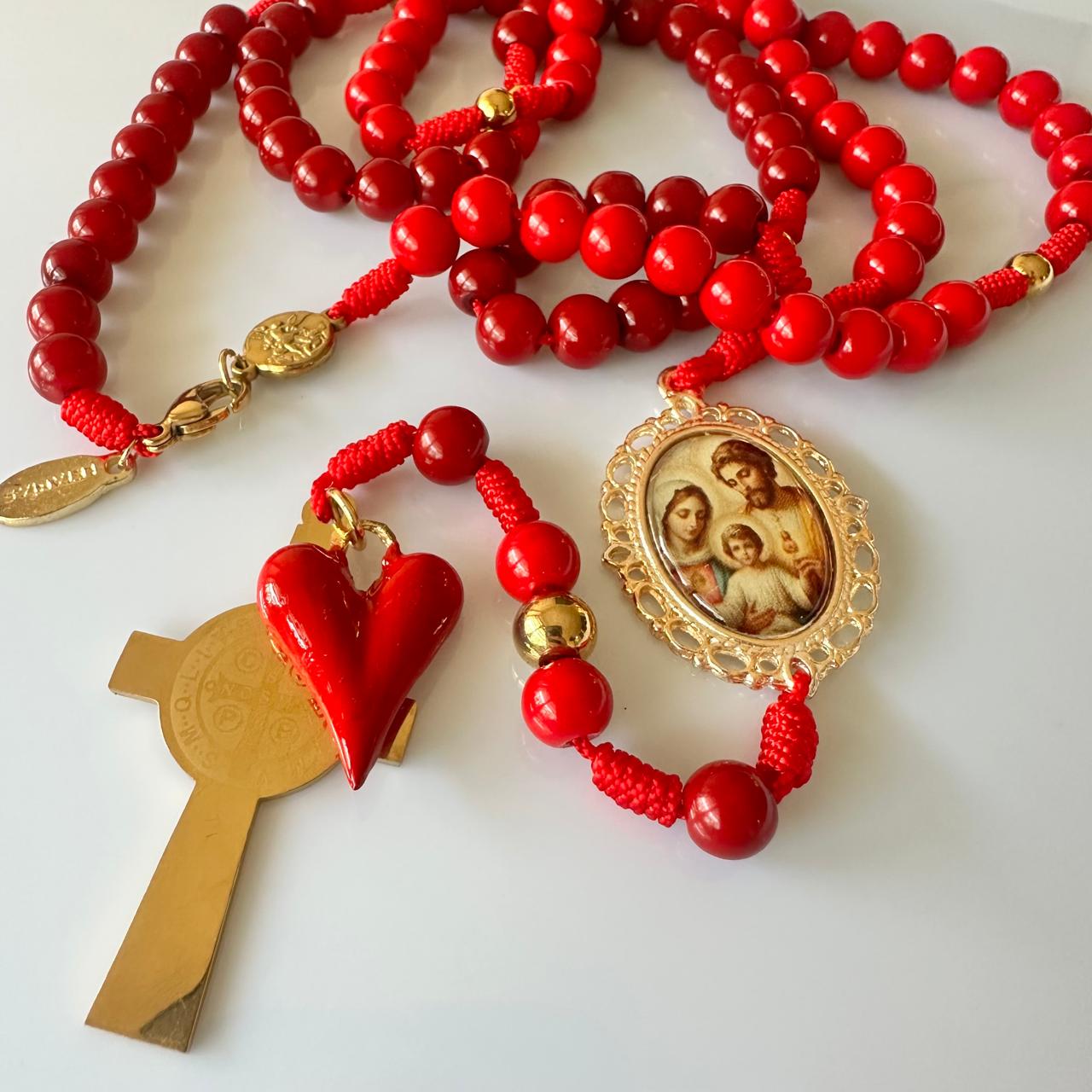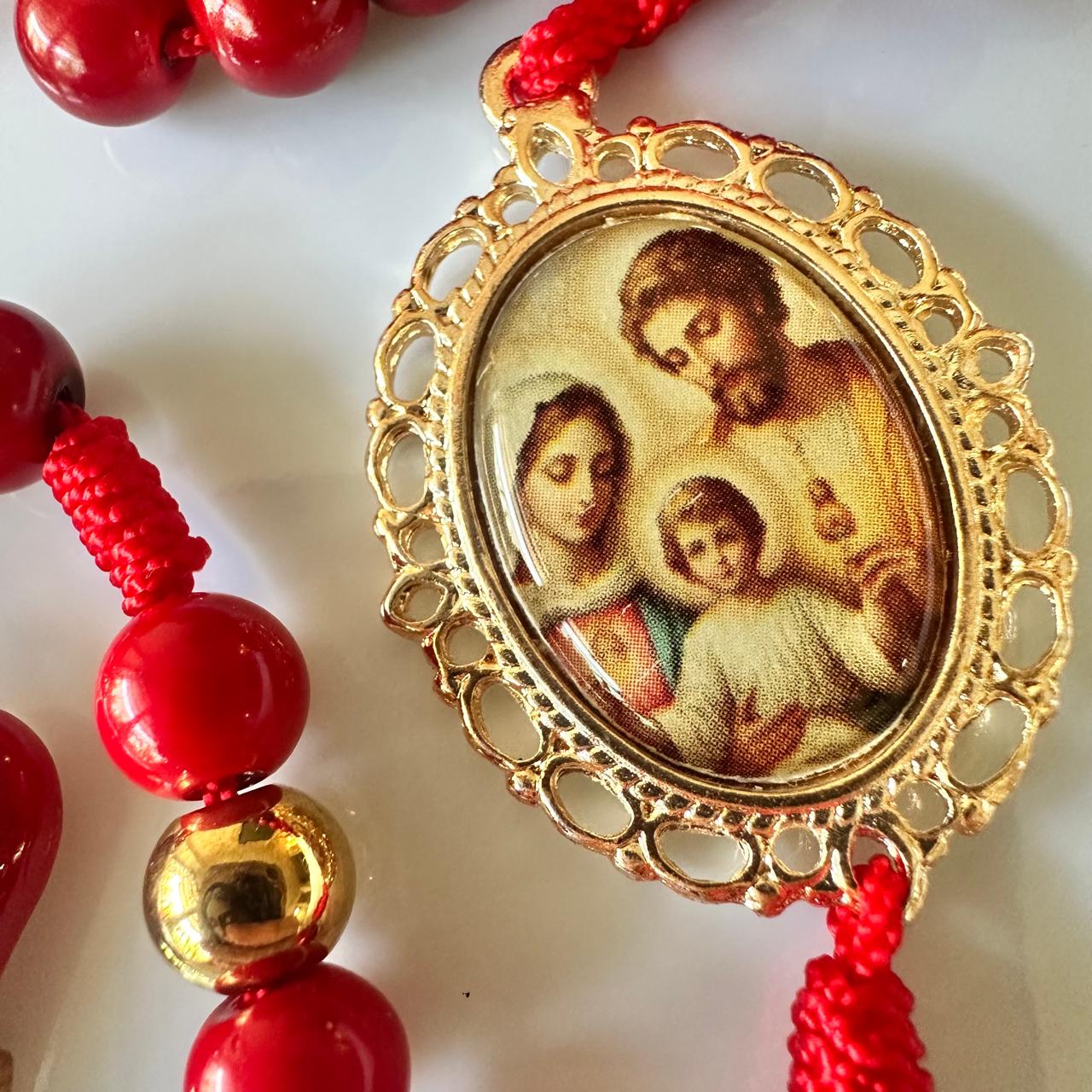Dos Camandulas unidas en una bella medalla de la Sagrada Familia. El tono rojo oscuro es la camandula para orar el Rosario a San José, y el de tono más claro es la camandula para orar el Rosario a María. Ideal regalo para fomentar la oración en familia. Son dos rosarios unidos en el Corazón de Jesús.