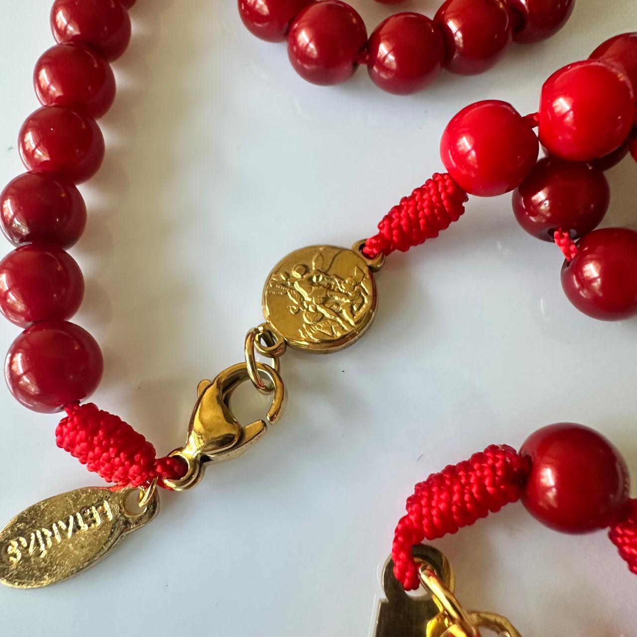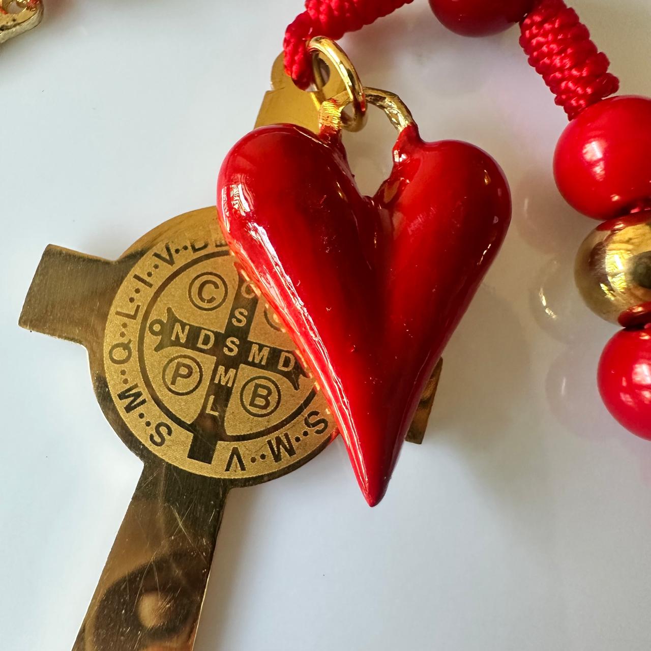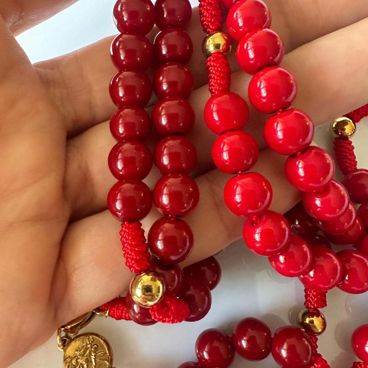 Dos Camandulas unidas en una bella medalla de la Sagrada Familia. El tono rojo oscuro es la camandula para orar el Rosario a San José, y el de tono más claro es la camandula para orar el Rosario a María. Ideal regalo para fomentar la oración en familia. Son dos rosarios unidos en el Corazón de Jesús.