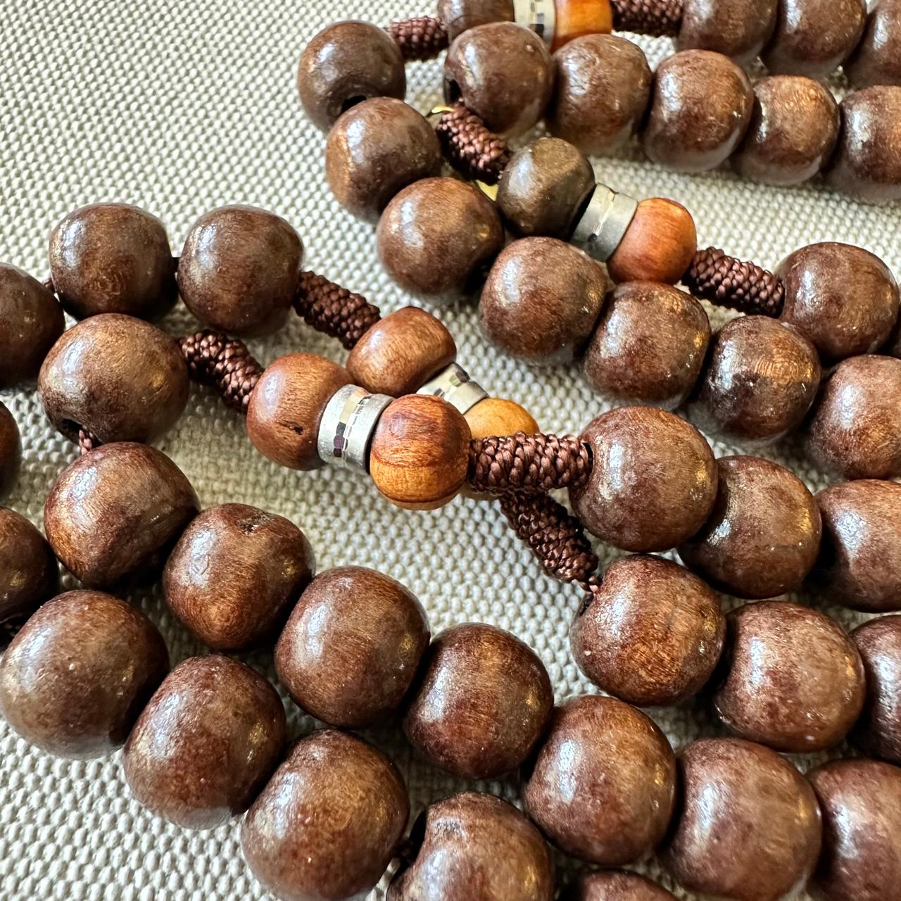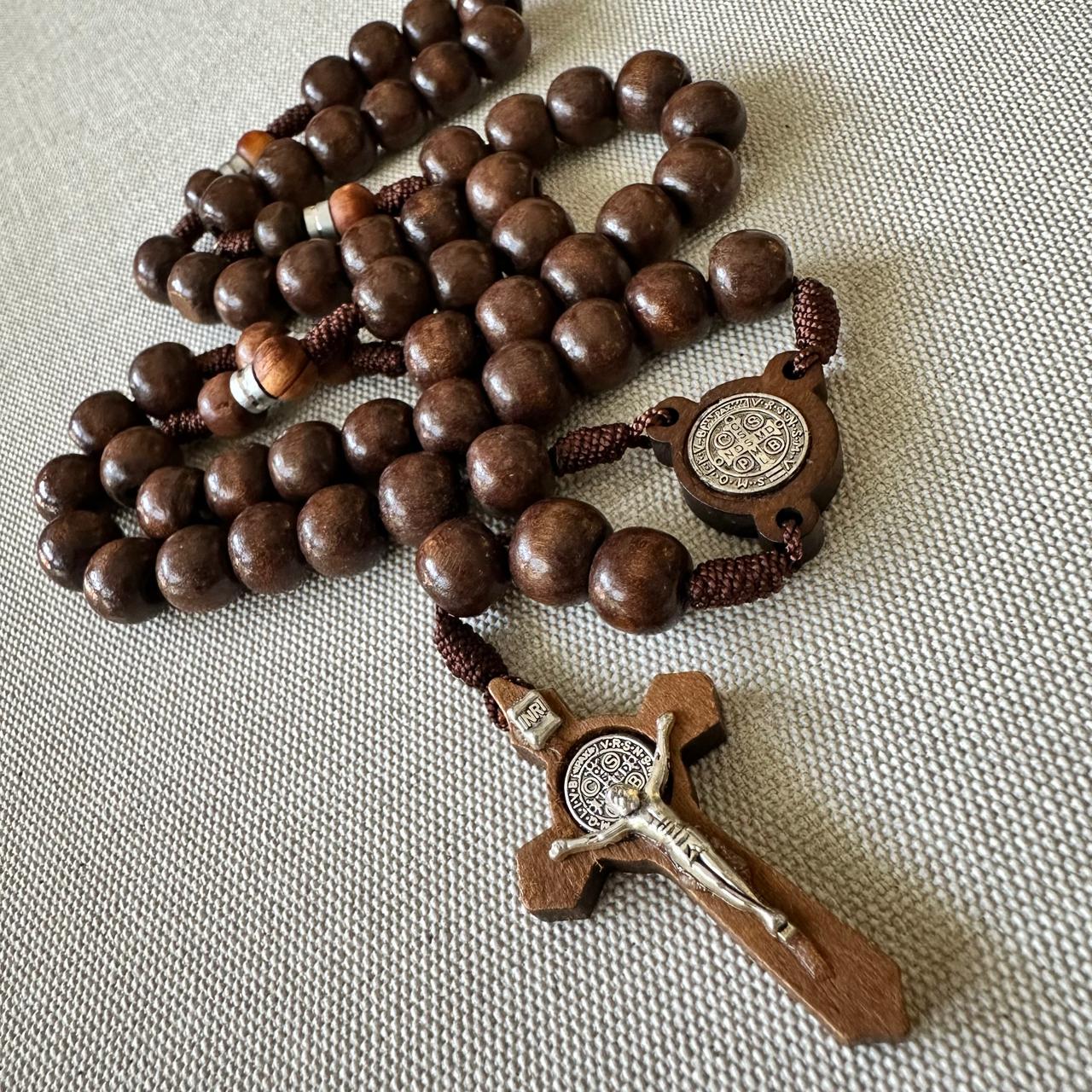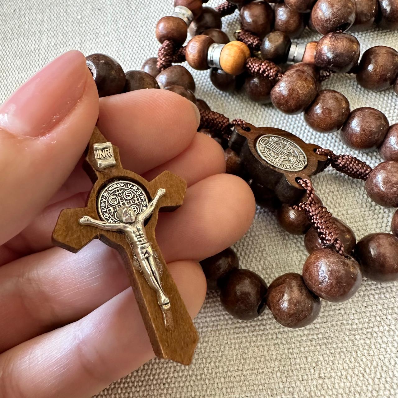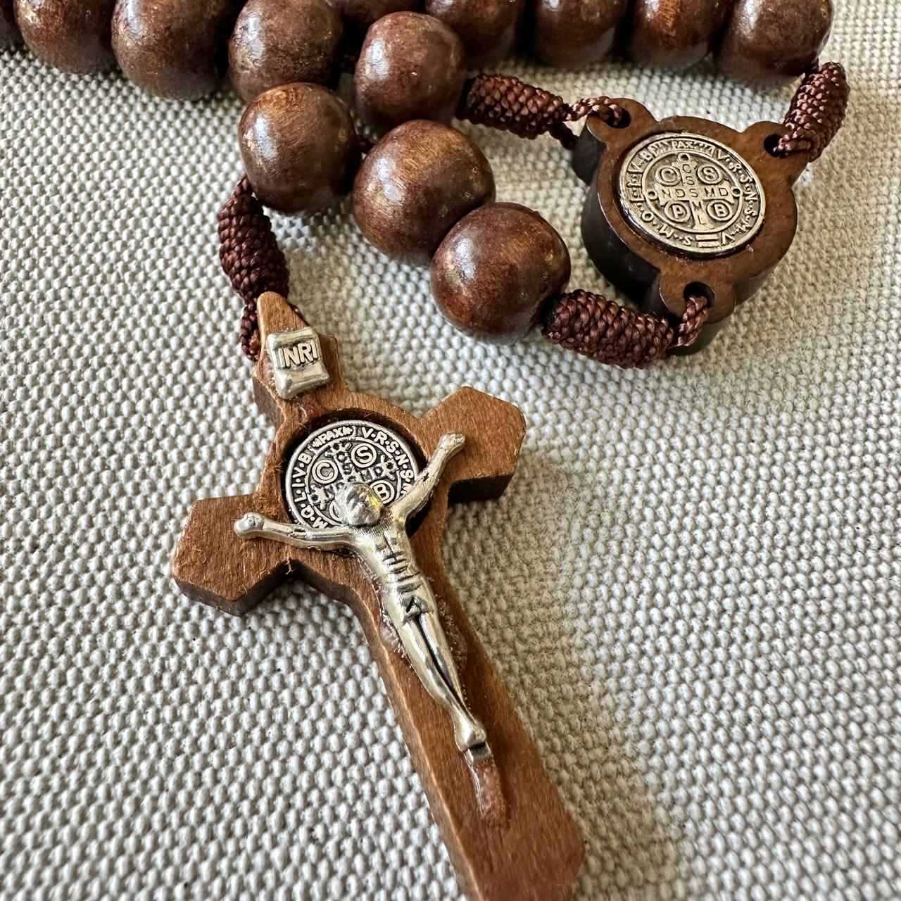 Rosario tradicional elaborado artesanalmente con cuentas de madera natural, el centro y la cruz del Rosario tienen la medalla de San Benito, símbolo de protección espiritual y fortaleza contra el mal.