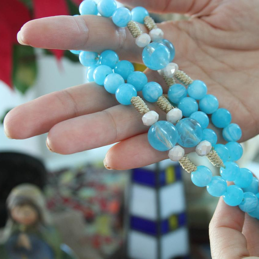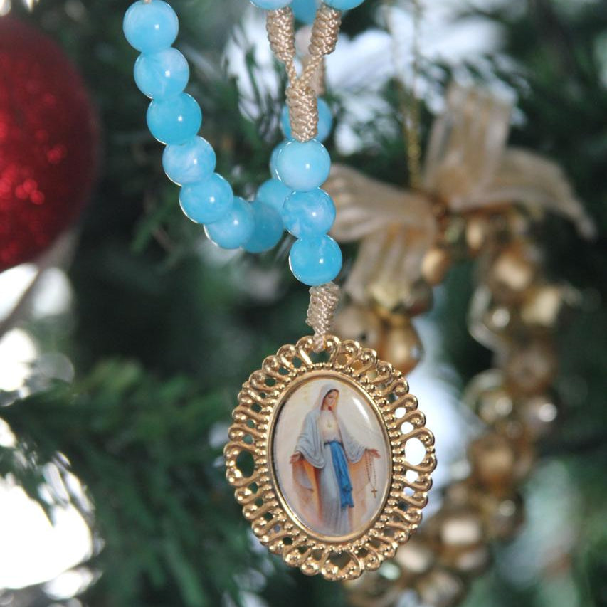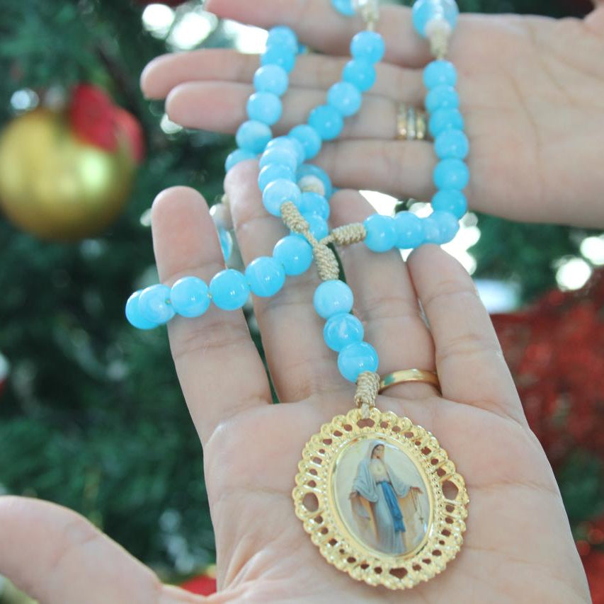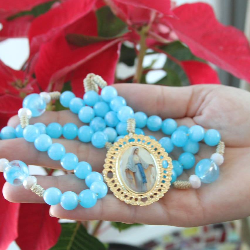 Rosario tradicional de tonos azules y medalla de la Virgen de la Medalla Milagrosa.