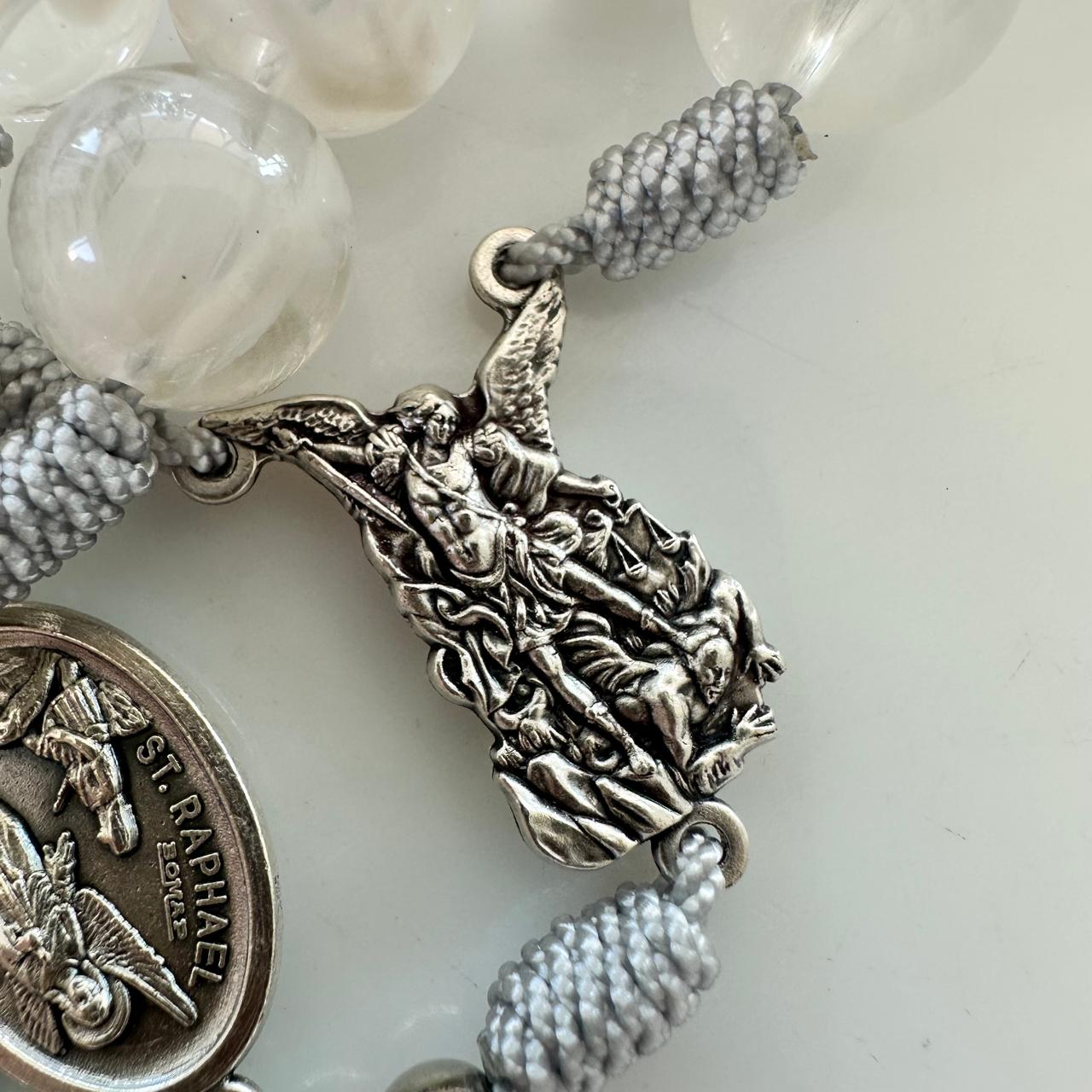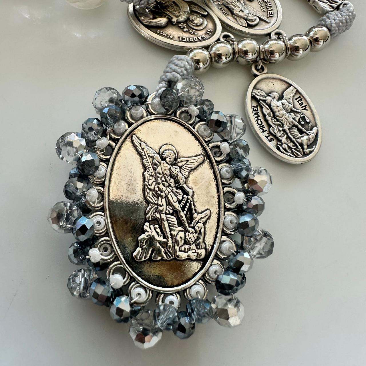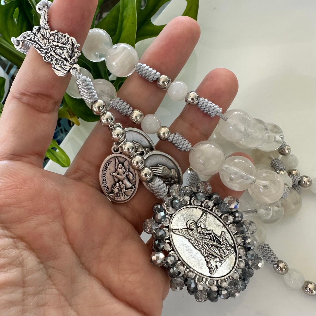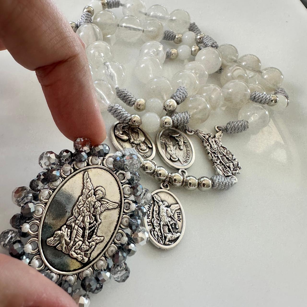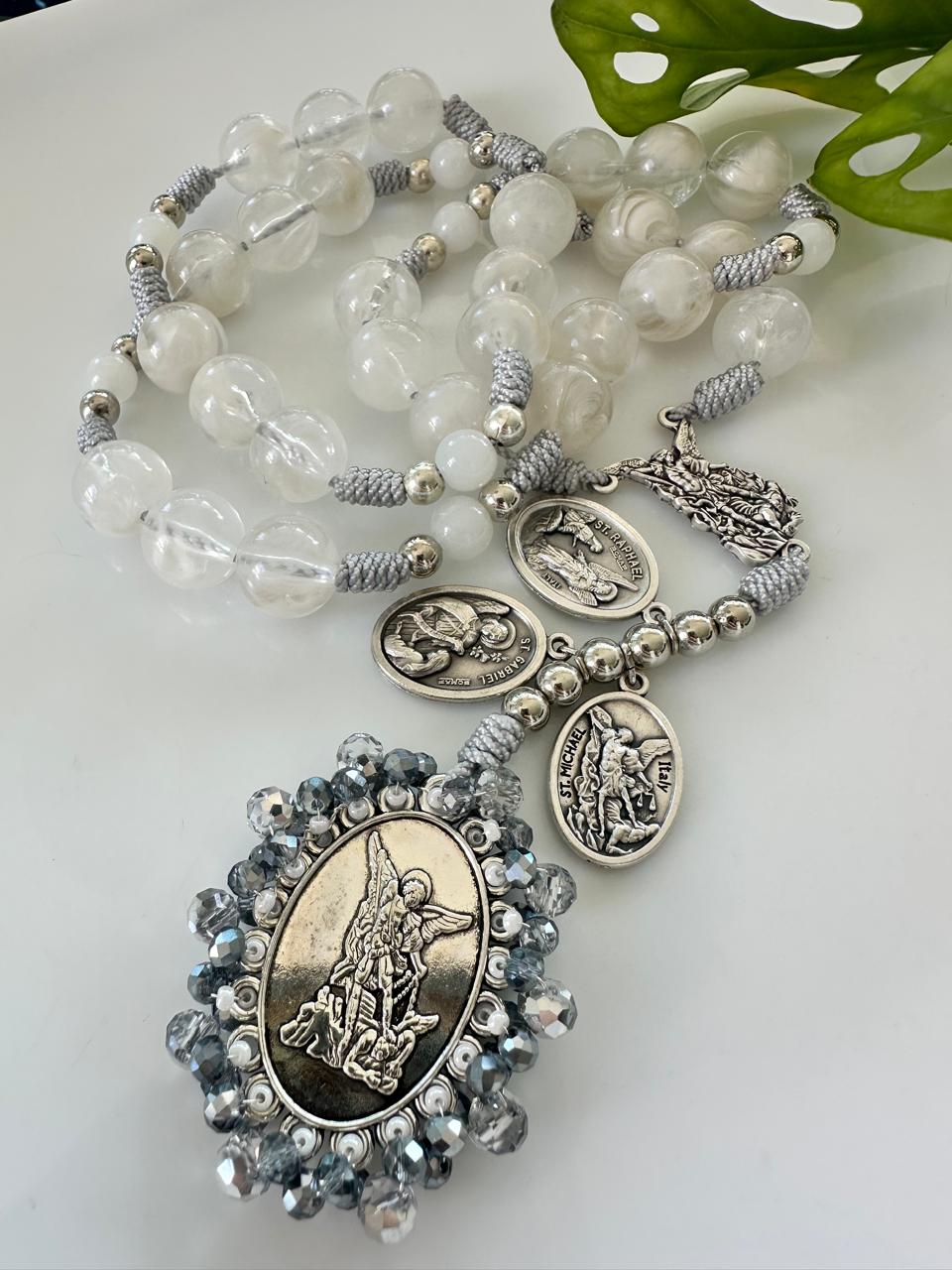 Camándula especial para orar la coronilla de San Miguel. Medalla recamada en tono blanco que evoca pureza y paz.