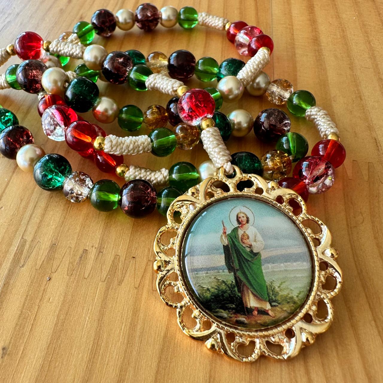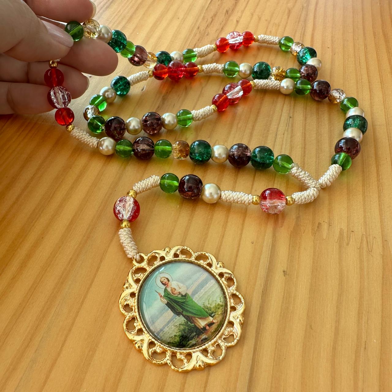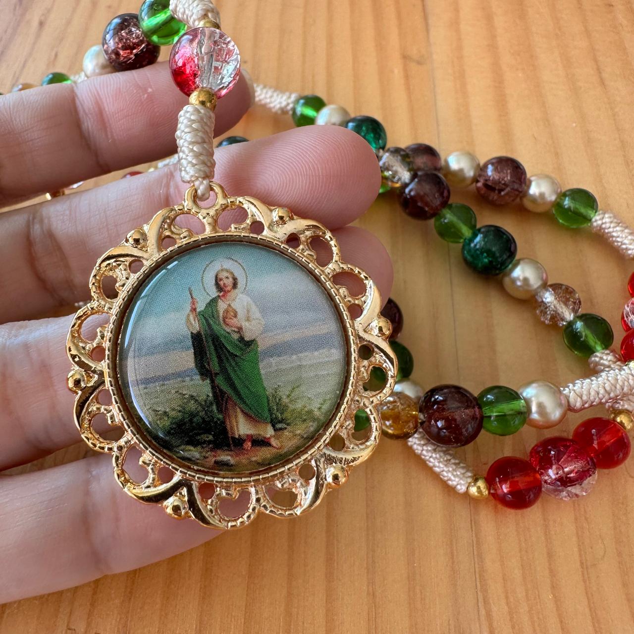 Rosario tradicional con medalla de San Judas, símbolo de fe y perseverancia.