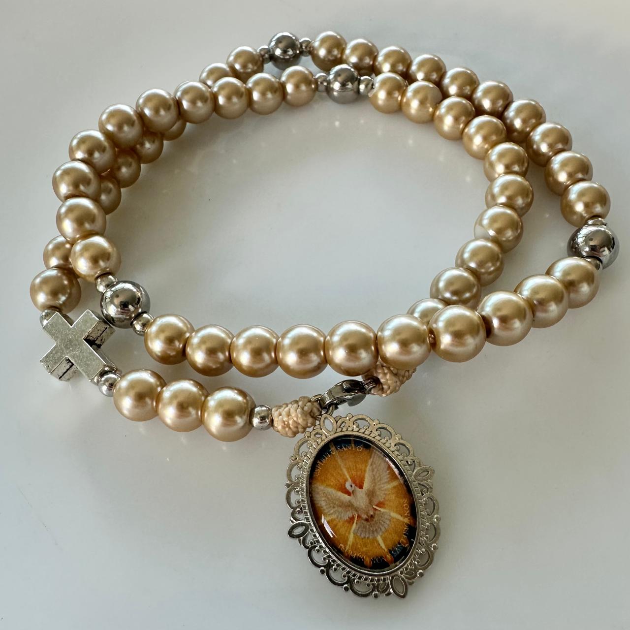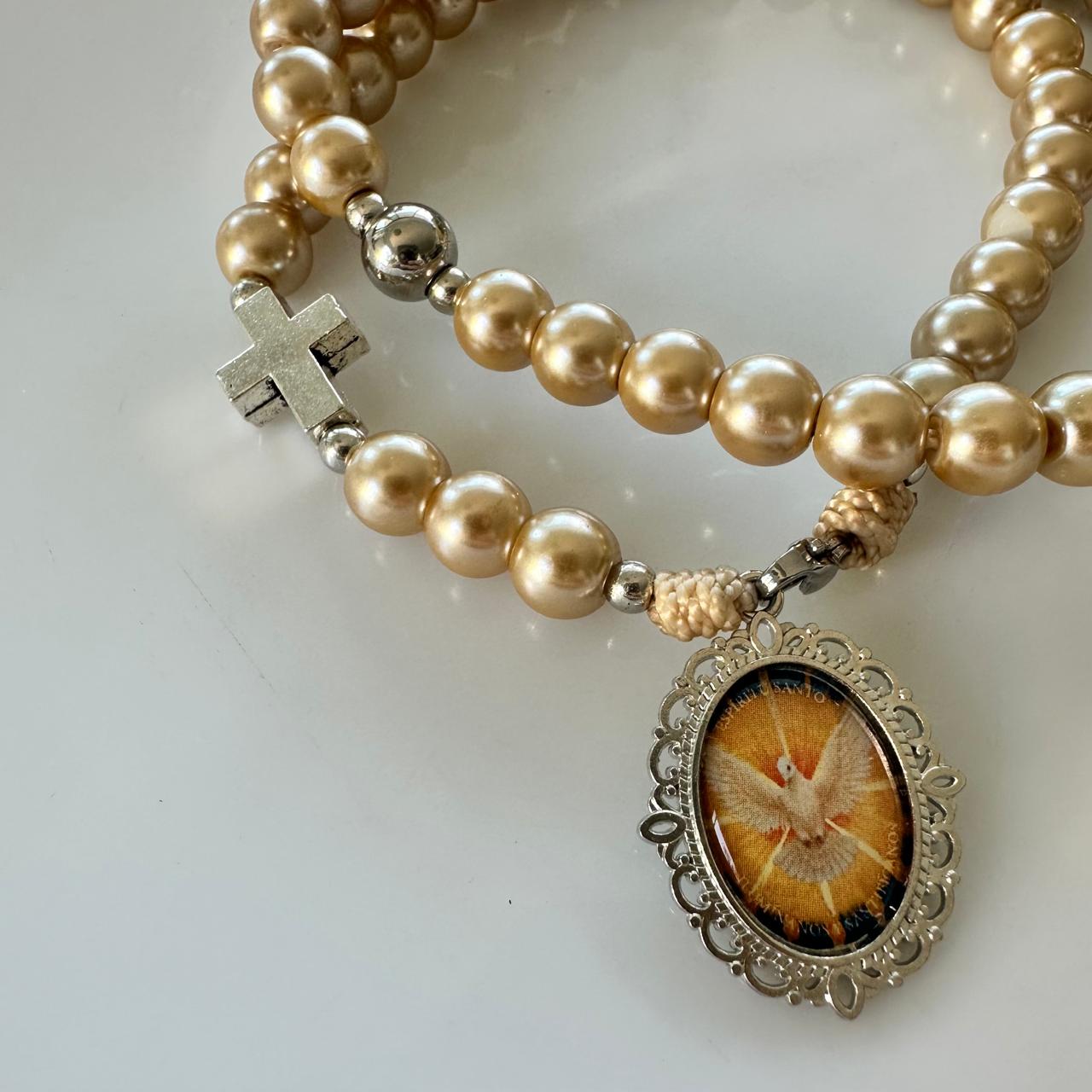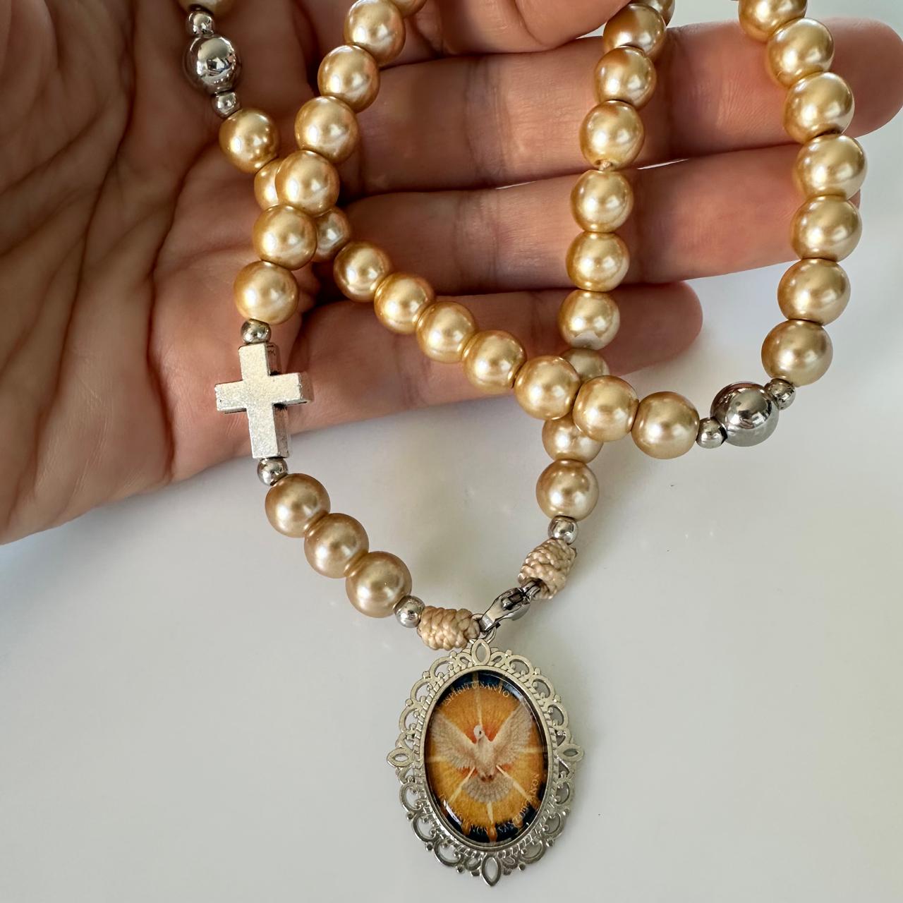 Rosario tradicional de perlas beige, tipo collar con medalla del Espíritu Santo.