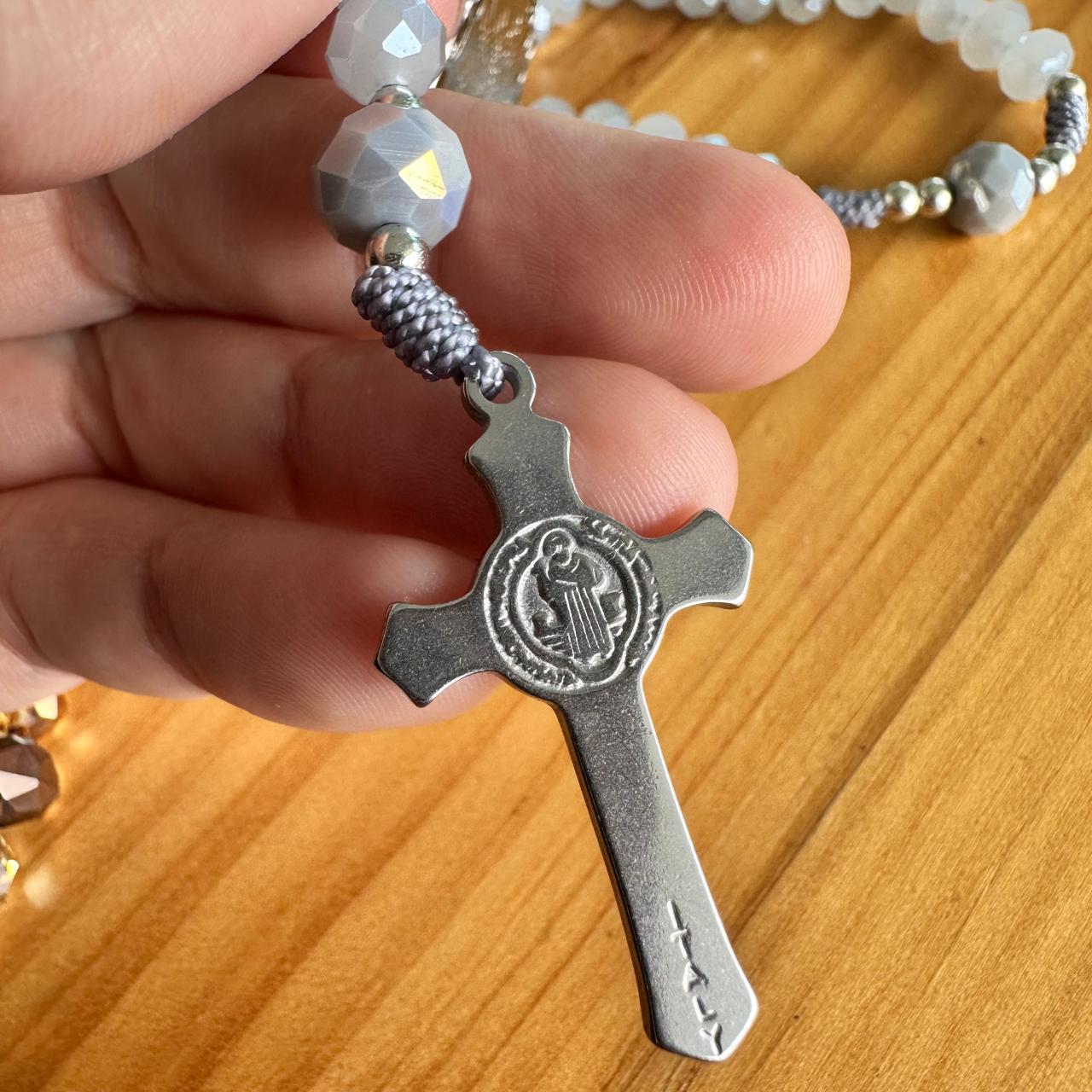 Rosario tradicional con medalla de la Virgen de Guadalupe y Cruz de San Benito.