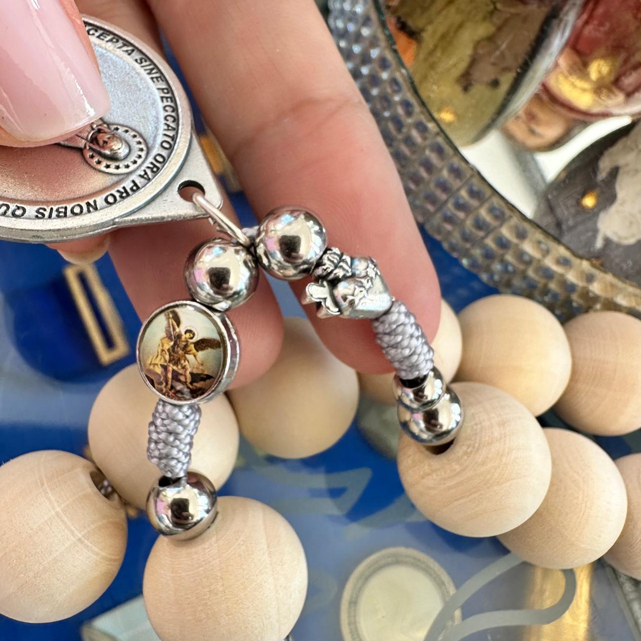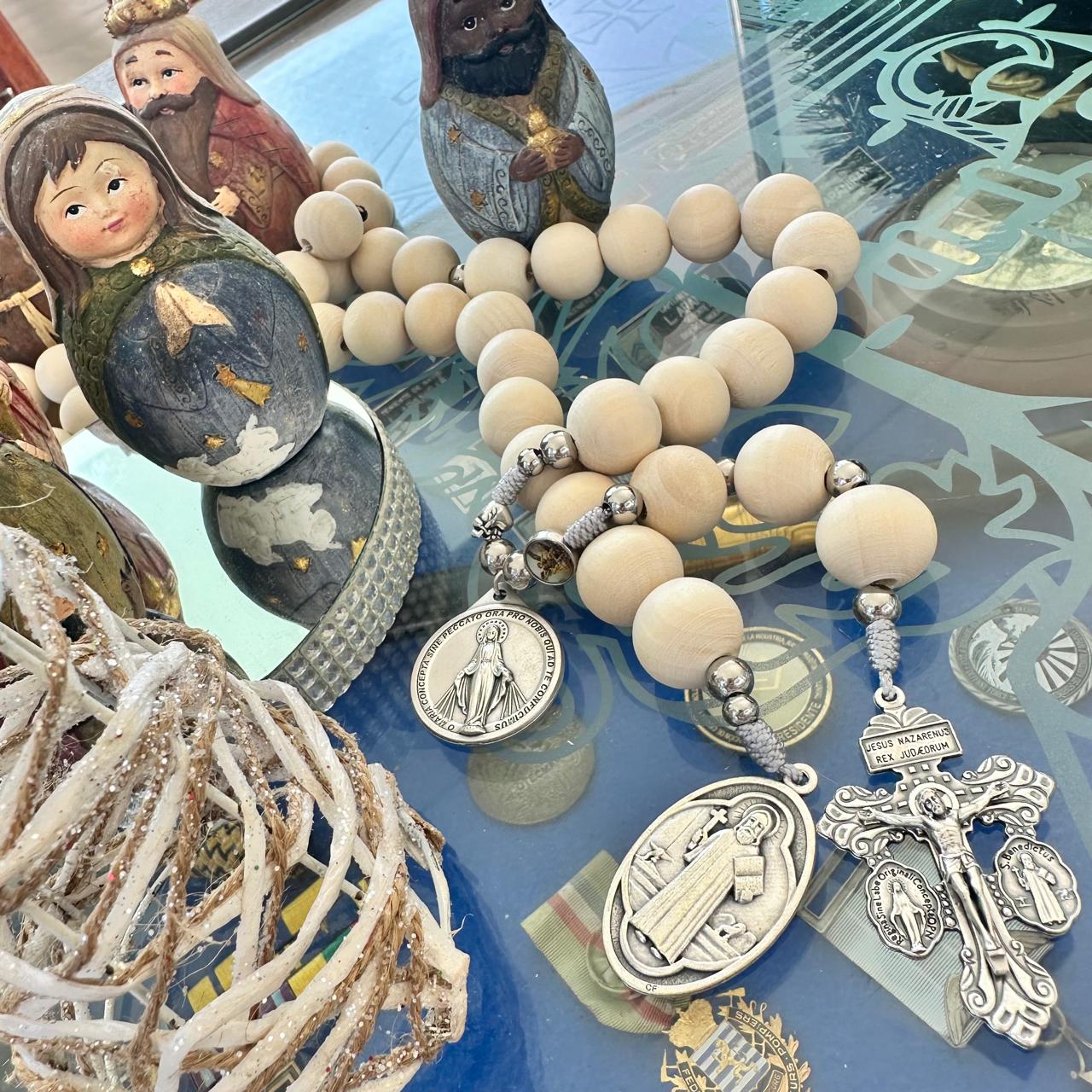Rosario lineal grande, con medalla de la Virgen Milagrosa y San Benito.