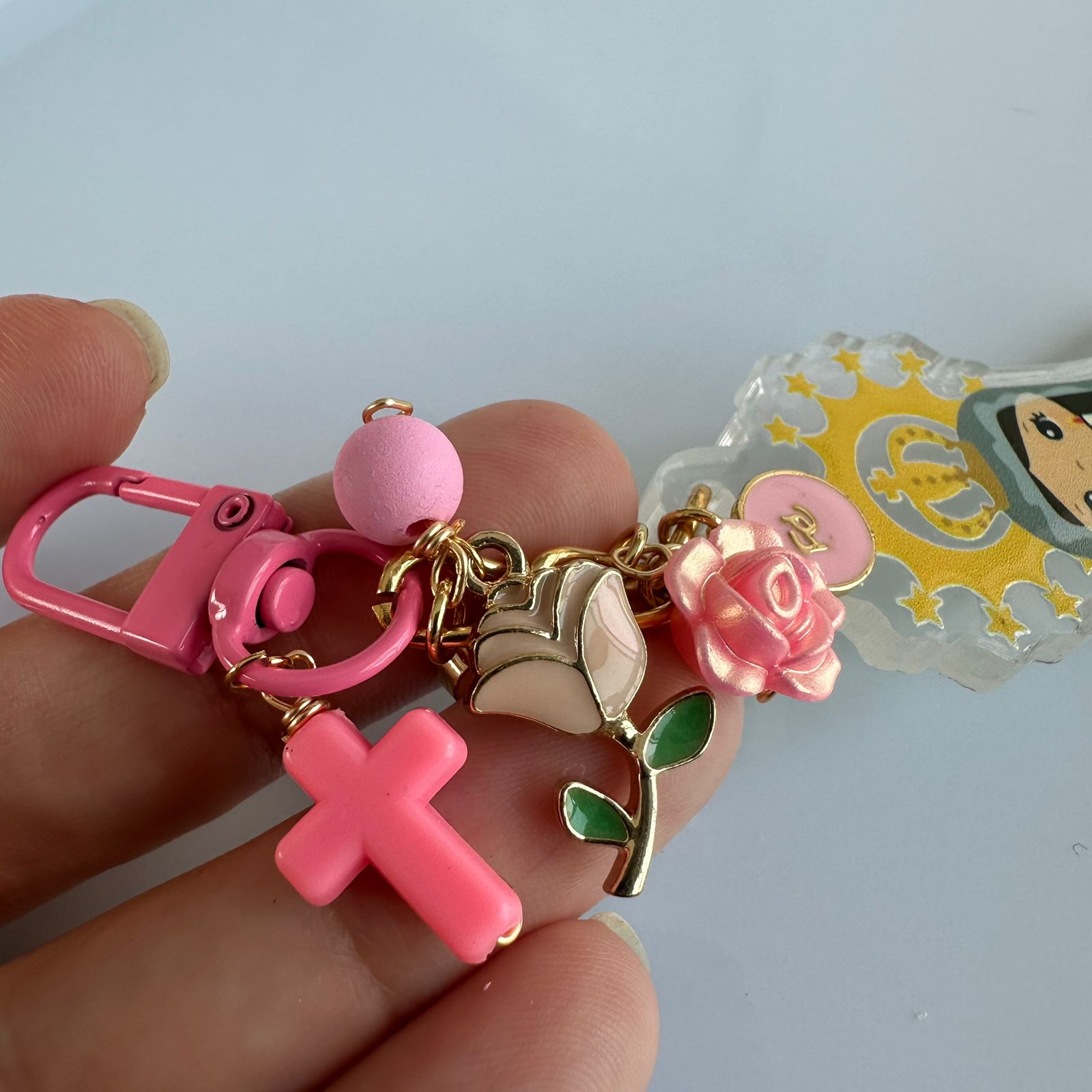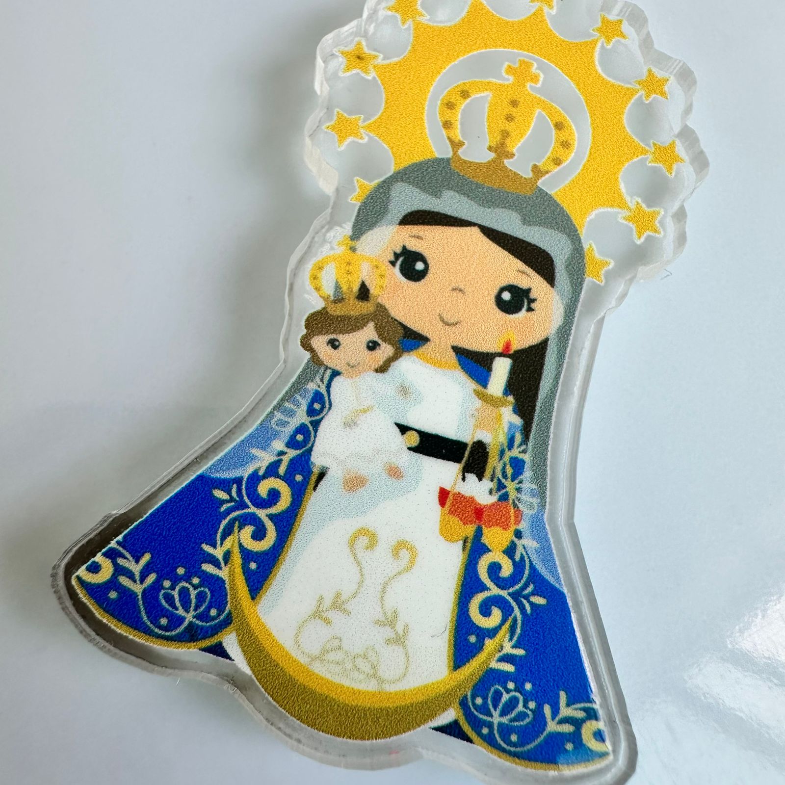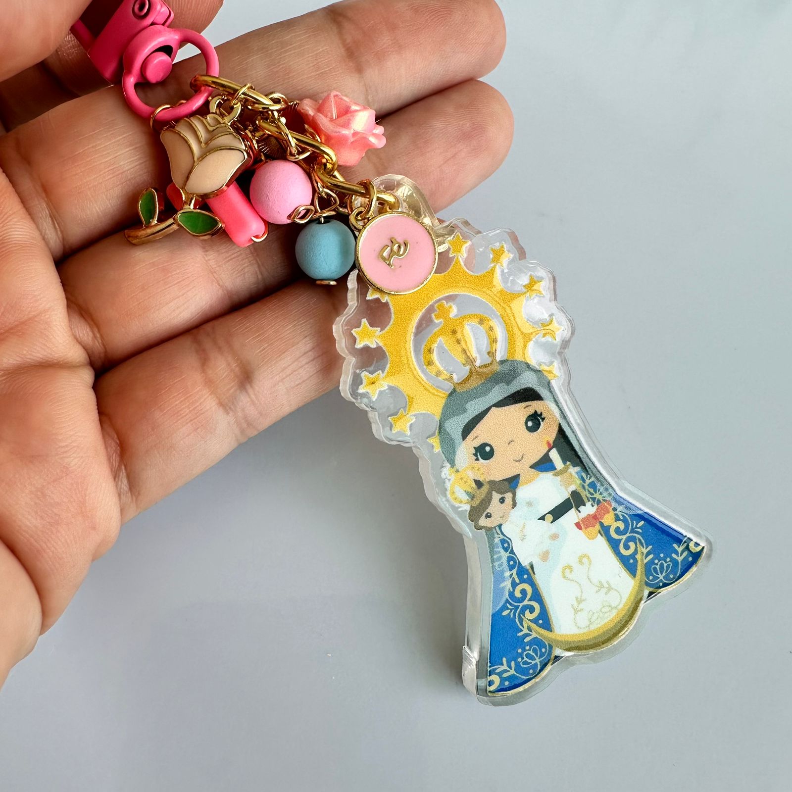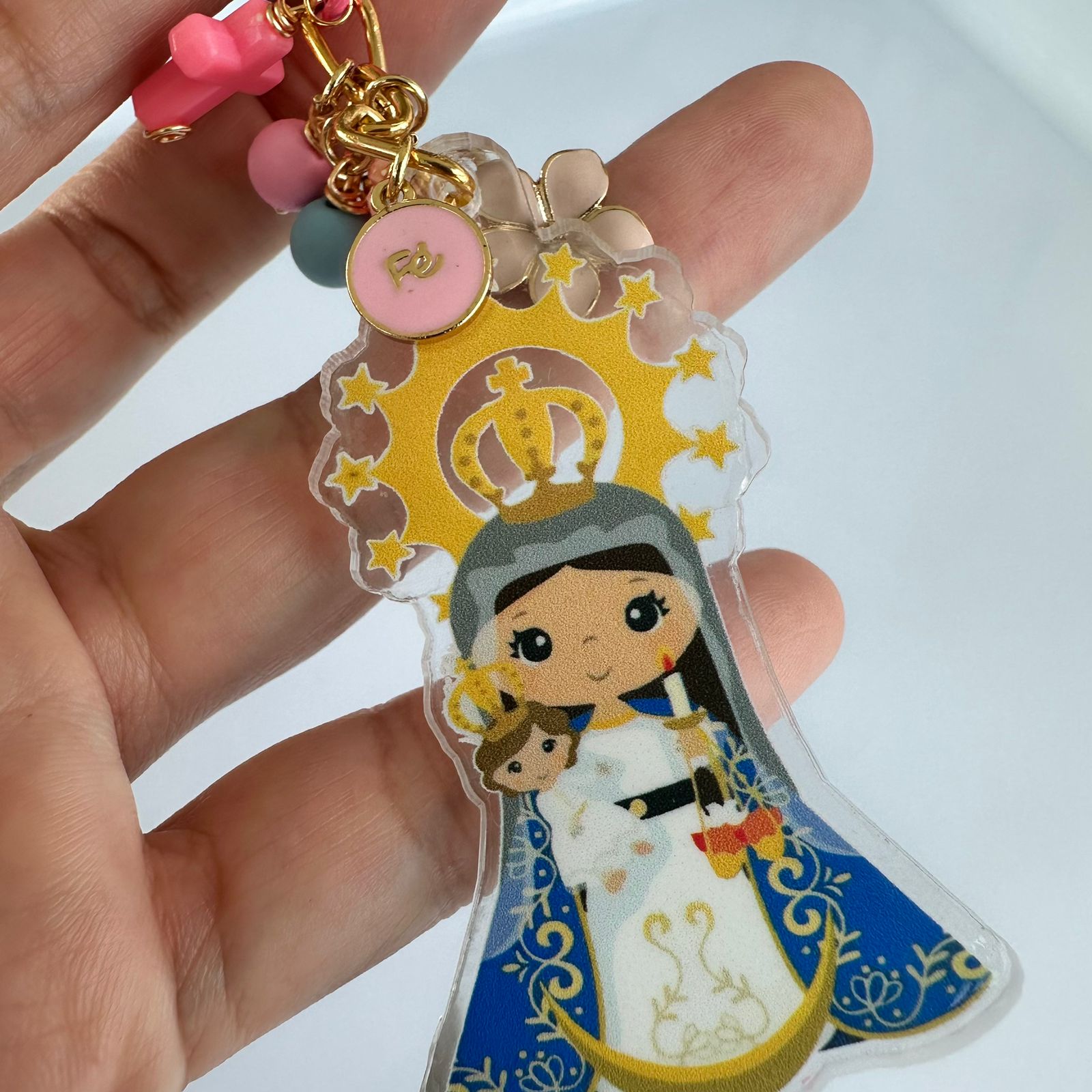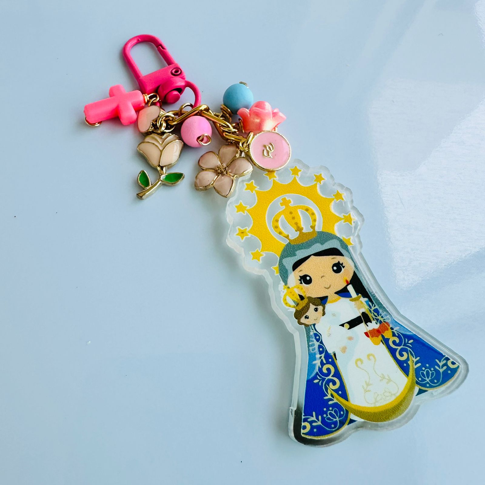 Llavero devocional con diseño de la Virgen de la Candelaria para niñas.