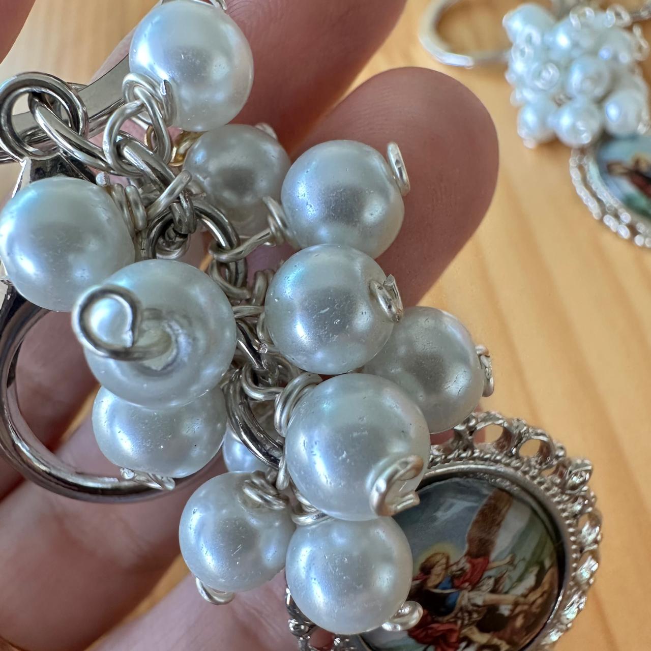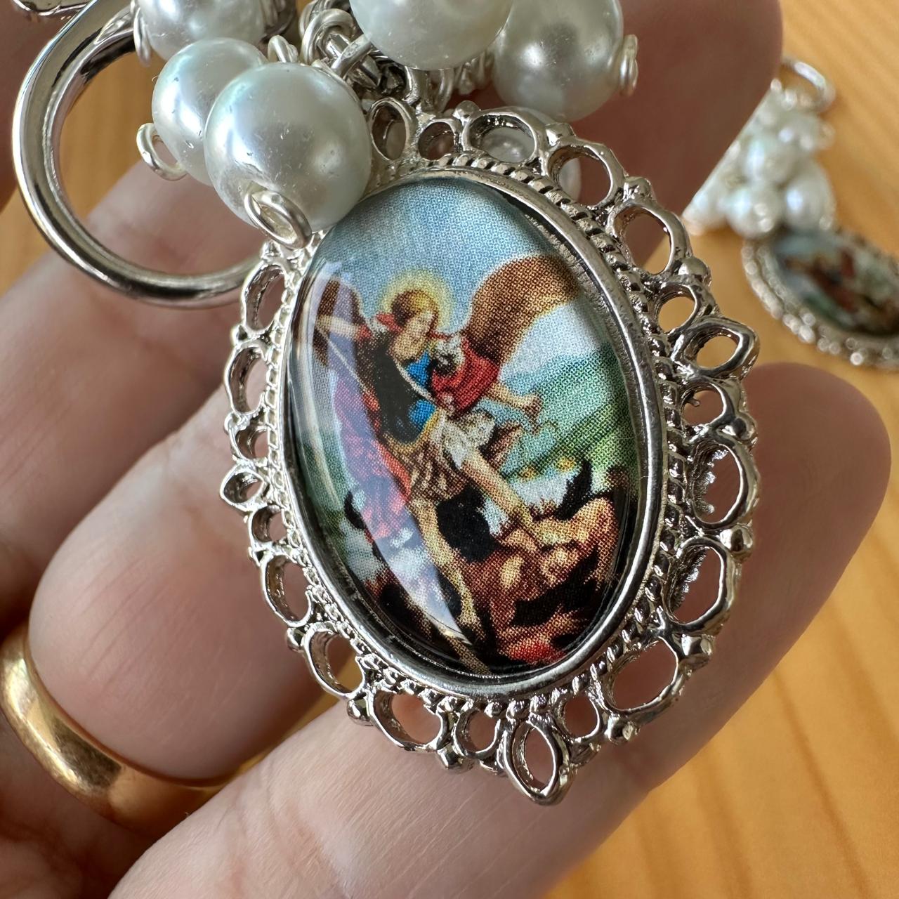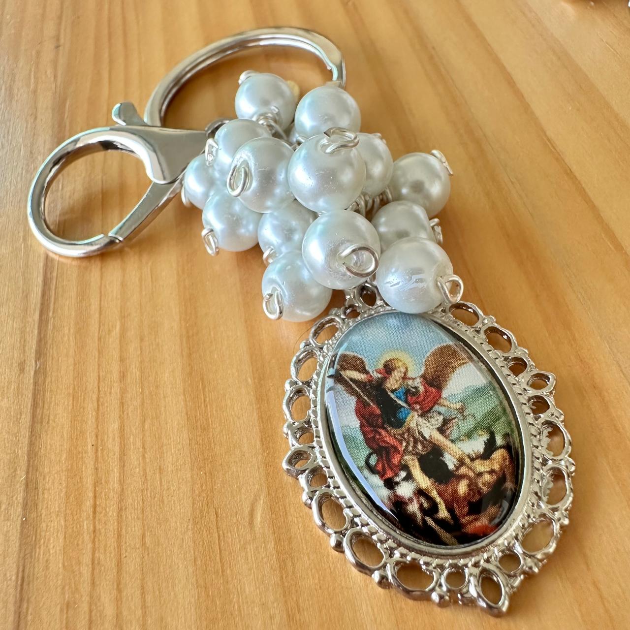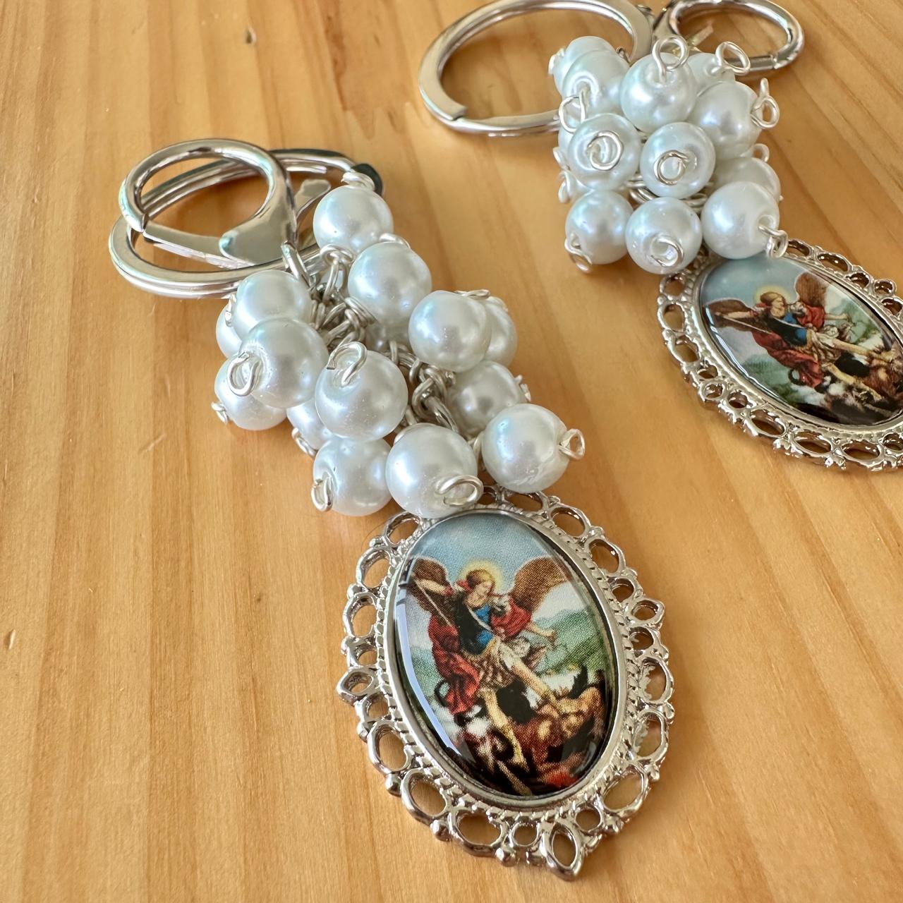Llavero de perlas con medalla de San Miguel Arcángel.