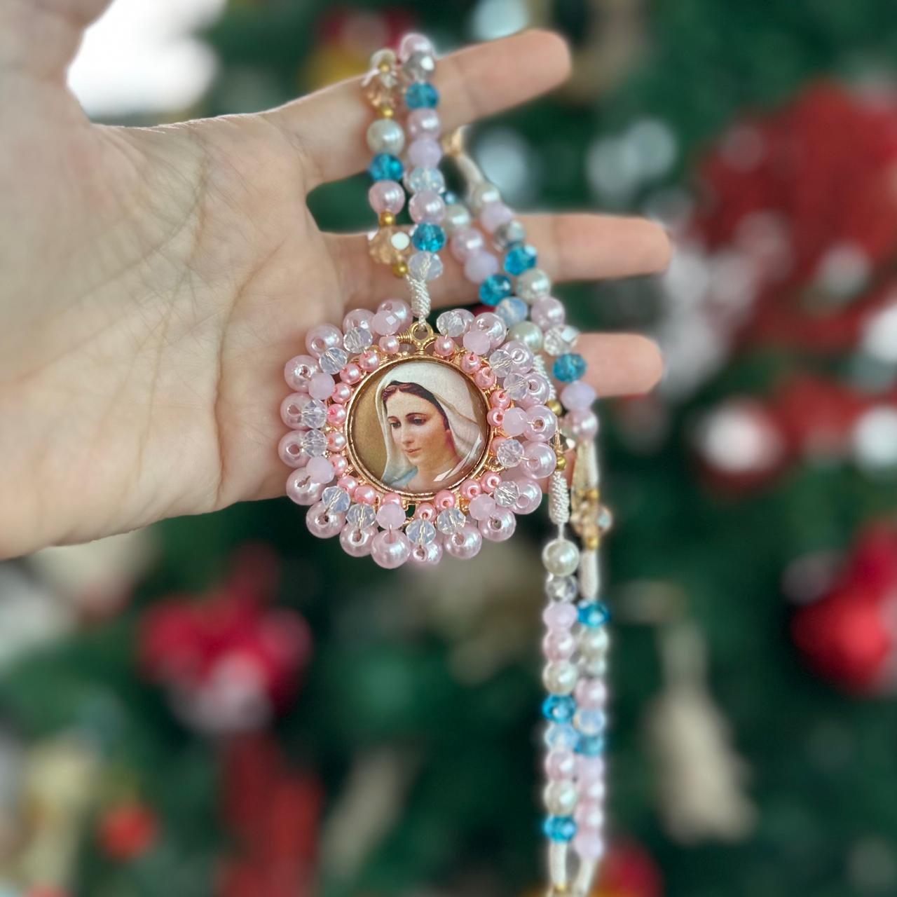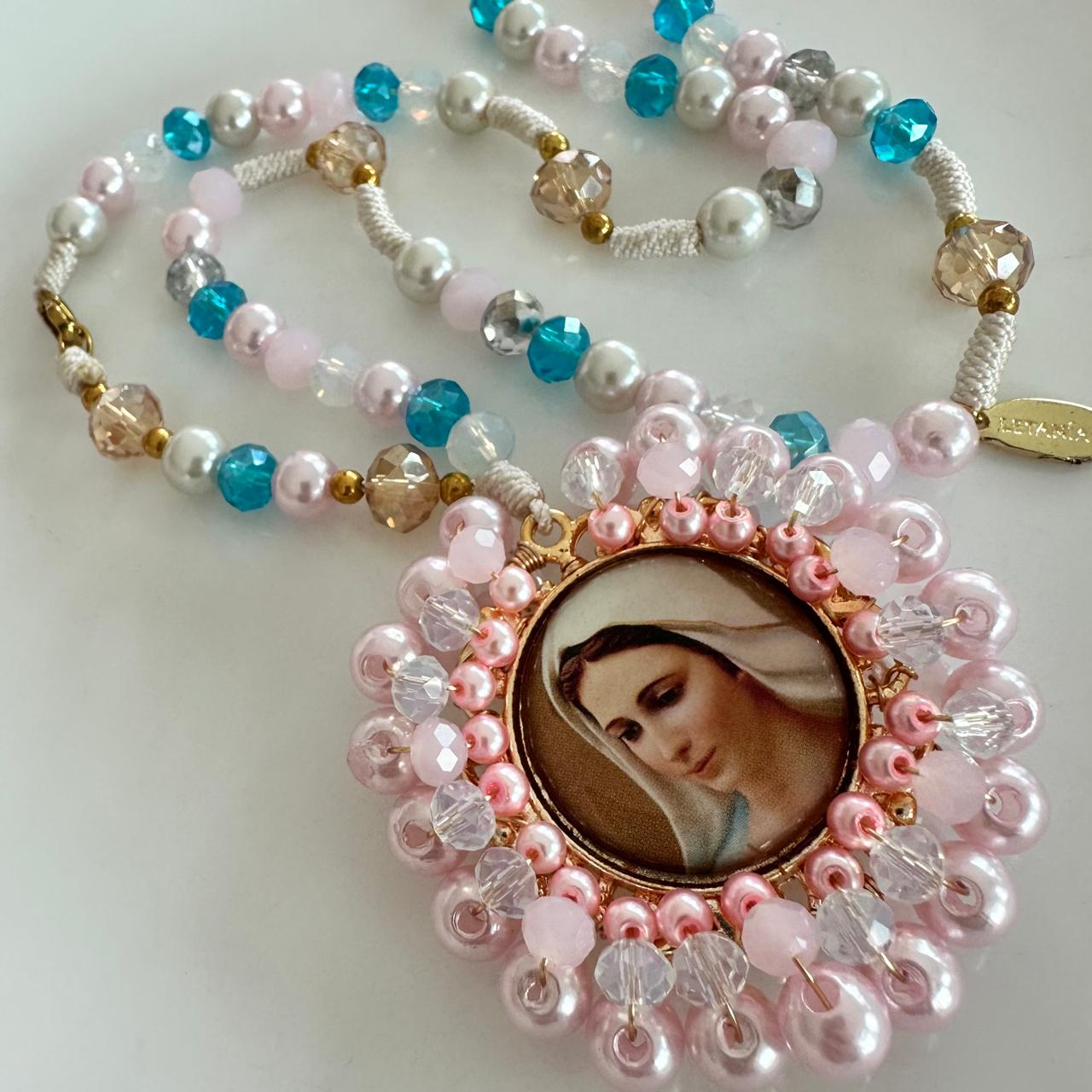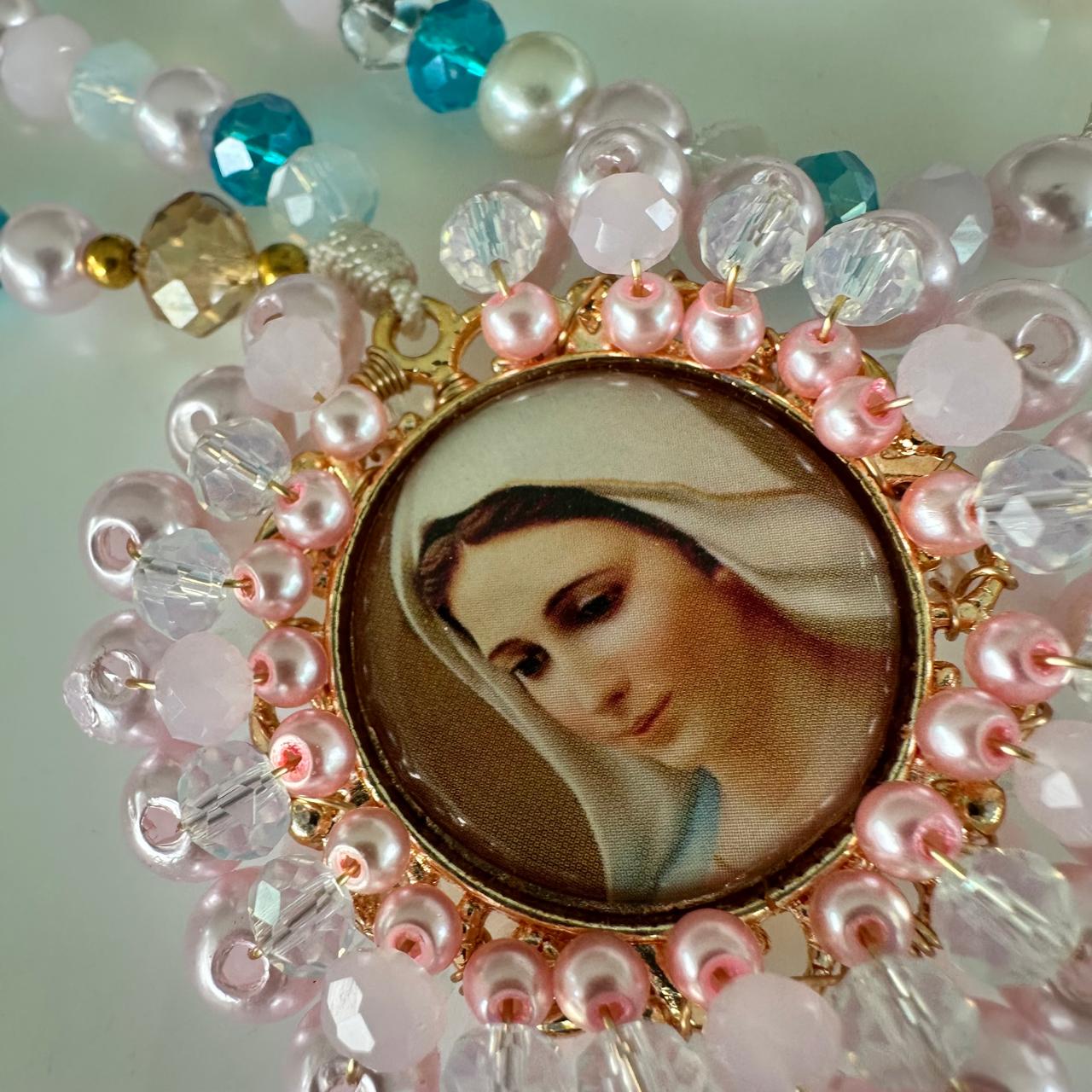 Rosario tradicional con medalla recamada de la Reina de la paz.